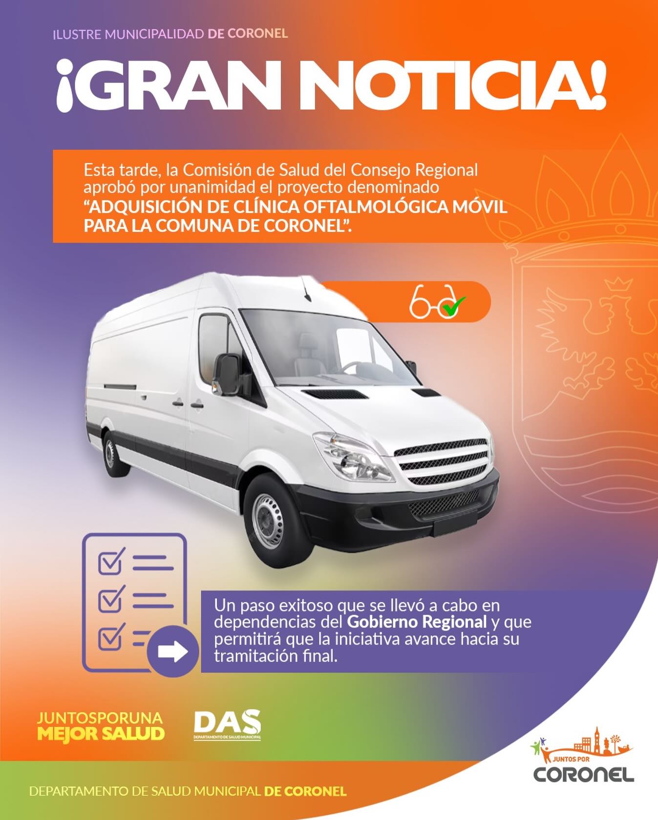 El proyecto consiste en la adquisición de una clínica oftalmológica, para la comuna de coronel. Esta iniciativa busca mejorar el acceso a la atención oftalmológica en nuestra comuna, especialmente en áreas remotas como Posta Patagual, Cecosf Escuadrón-Villa La Posada e la isla Santa María, beneficiando a 89.148 usuarios registrados. Actualmente, los residentes de estas zonas deben realizar largos viajes para recibir atención oftalmológica, lo que es particularmente difícil para los 62.379 usuarios de entre 15 y 64 años.
